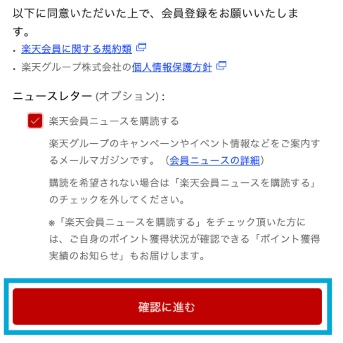 - 楽天会員利用規約を確認の上、[確認に進む]をクリックしてください。