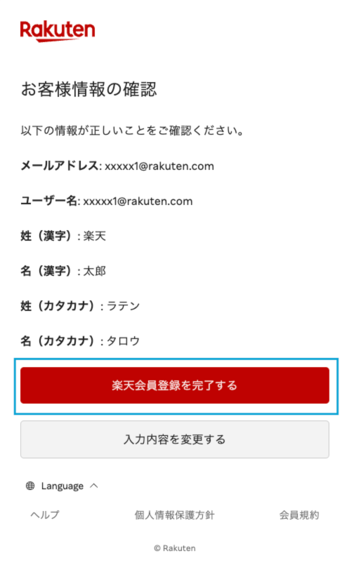 - 入力内容を確認の上[楽天会員登録を完了する]をクリックしてください。楽天ID(ユーザー名)とパスワードをお忘れにならないよう、ご注意ください。